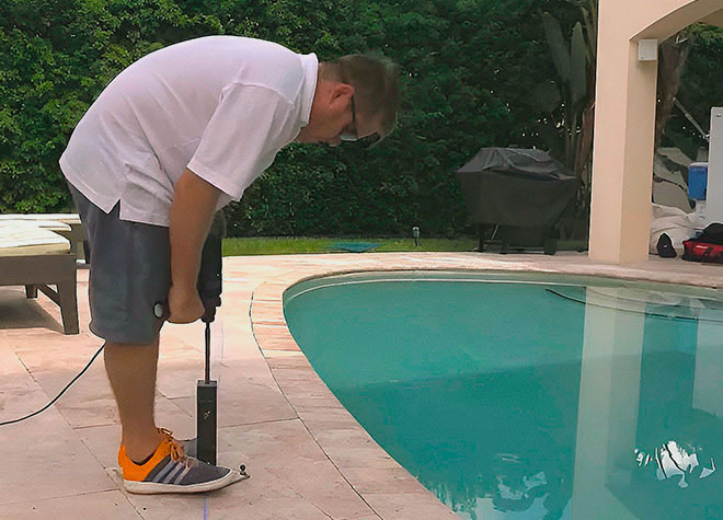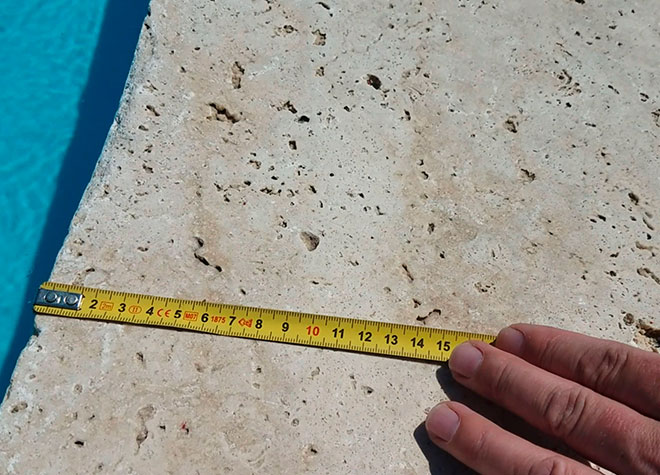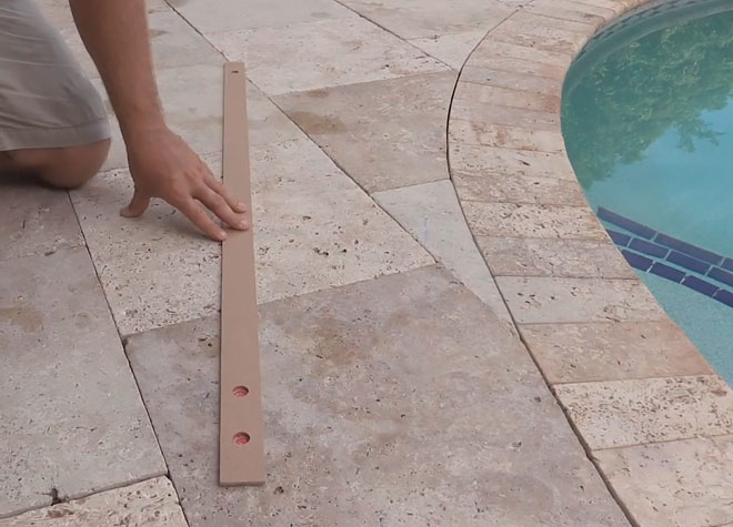 Meet de Securipool zwembadbarrière ten opzichte van het zwembad. Trek een lijn zodat de palen uitgelijnd zijn. Markeer de plaats van het te boren gat met een pen.